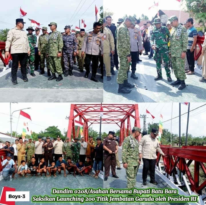 Komandan Kodim (Dandim) 0208/Asahan, Letkol Inf Edy Syahputra, S.H., M.I.P., mendampingi Bupati Batu Bara, H. Baharuddin Siagian, S.H., M.Si., dalam peresmian serentak program Jembatan Garuda oleh Presiden RI, H. Prabowo Subianto, pada Senin (09/03/2026).