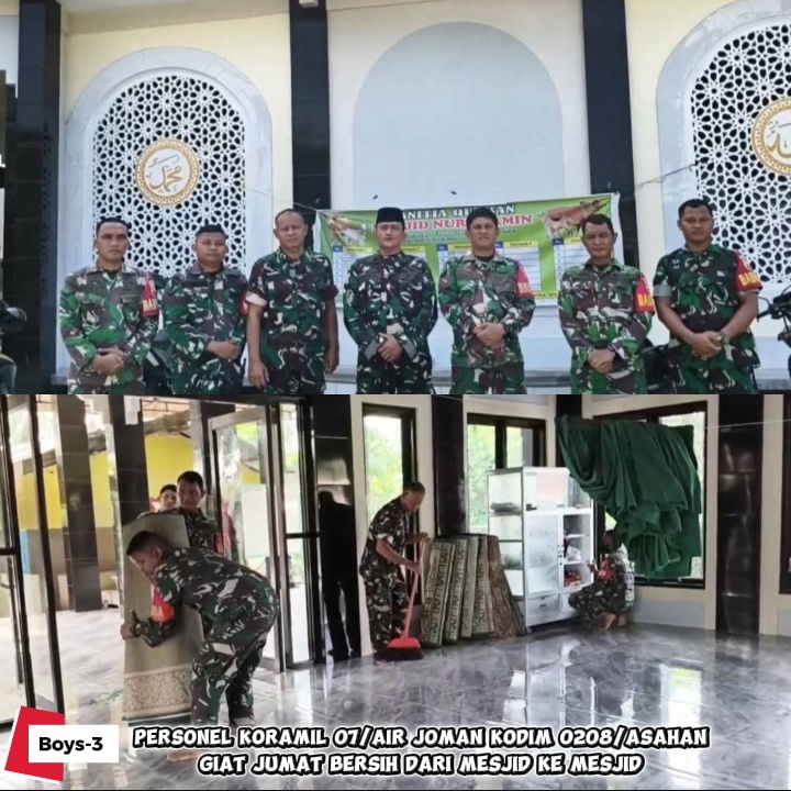 Dalam rangka menyemarakkan bulan suci Ramadhan 1447 Hijriah, personel Koramil 07/Air Joman Kodim 0208/Asahan terus menunjukkan kepedulian terhadap kebersihan rumah ibadah dengan melaksanakan kegiatan Jumat Bersih dari masjid ke masjid di wilayah binaannya.