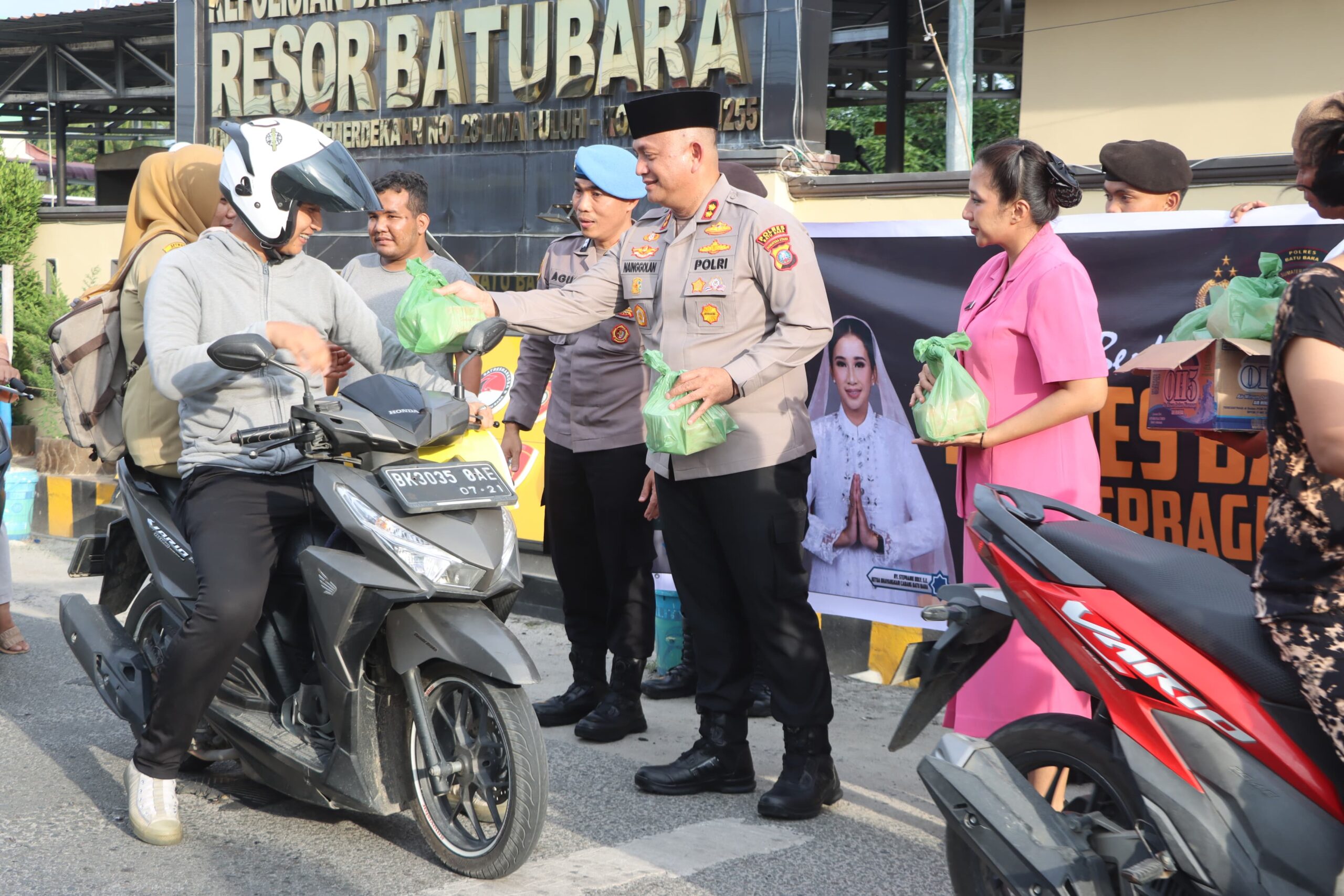 Dalam rangka menyemarakkan bulan suci Ramadan, Kapolres Batu Bara AKBP Doly Nelson H.H Nainggolan, S.H., M.H bersama Ketua Bhayangkari Cabang Batu Bara Ny. Stephanie Doly, S.E, didampingi para Pejabat Utama (PJU), menggelar kegiatan bakti religi dengan berbagi takjil kepada masyarakat, Selasa (3/3/2026).