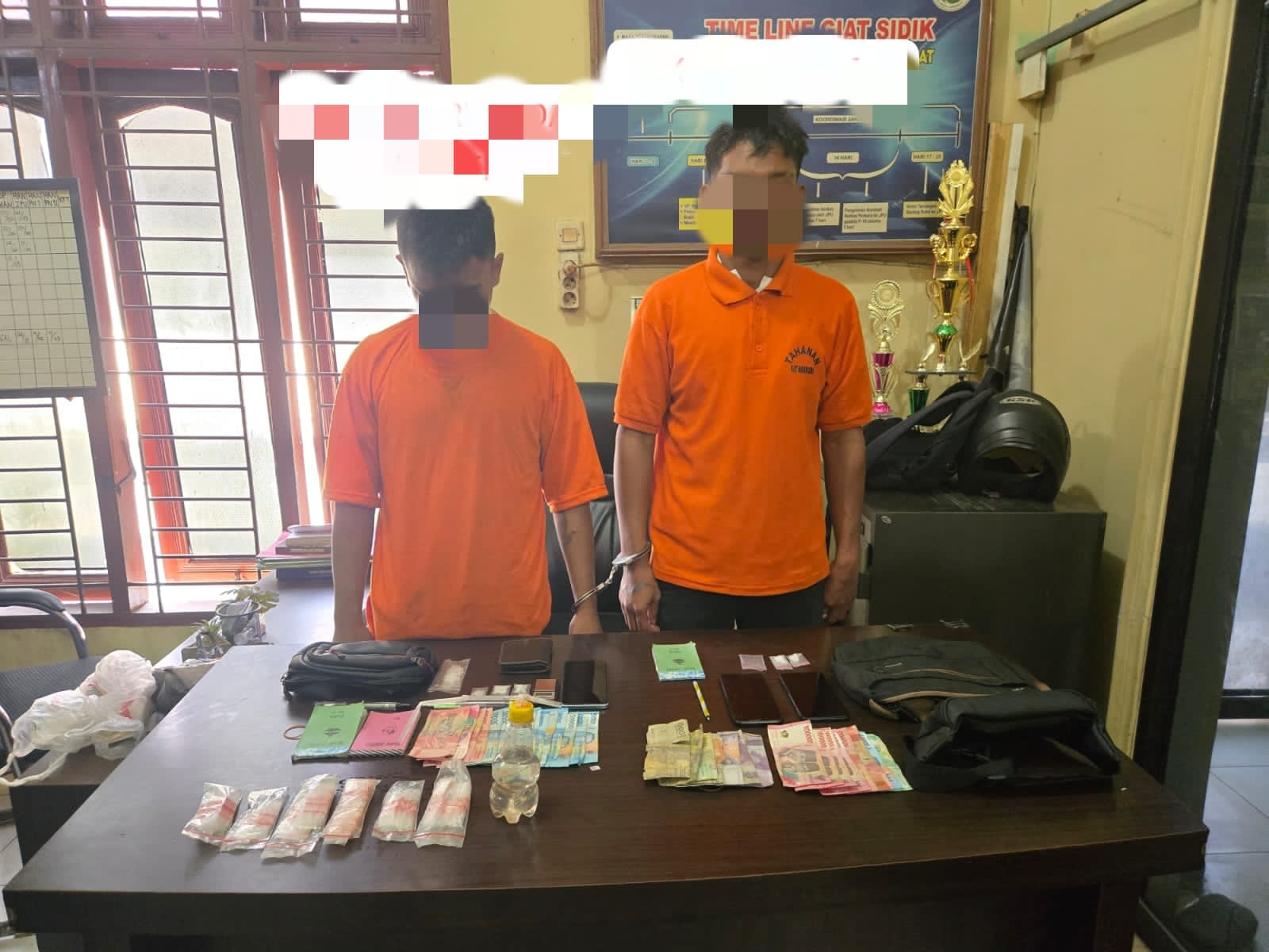 Dua orang diduga pelaku yang diamankan masing-masing berinisial M (22) dan TAS (20). Dari hasil penggeledahan terhadap kedua diduga pelaku dan lokasi kejadian, petugas menemukan barang bukti narkotika jenis sabu dari kedua diduga pelaku dengan berat bruto keseluruhan ± 4,92 gram, serta sejumlah barang lain yang berkaitan dengan aktivitas narkotika.