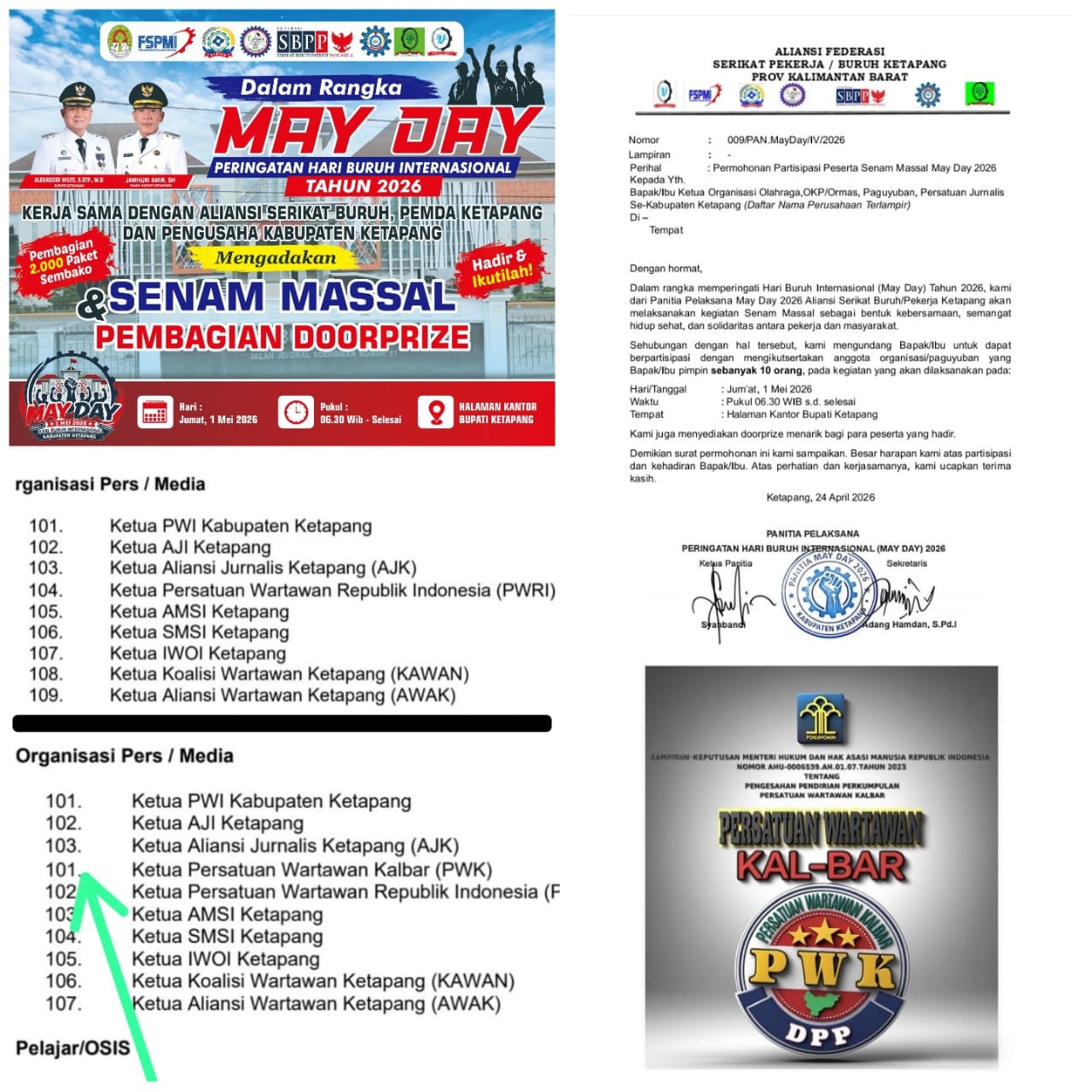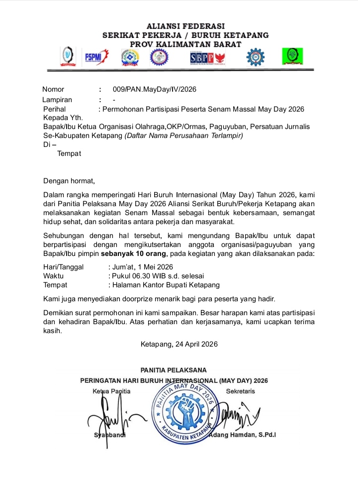 Ketapang,Detik Reportase.com Kalbar – Persatuan Wartawan Kalimantan Barat (PWK) mempertanyakan profesionalitas panitia pelaksana May Day 2026 setelah ditemukannya ketidaksesuaian dalam administrasi undangan resmi yang diterima.