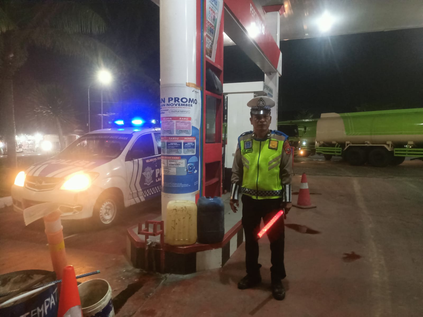 Petugas melakukan pemantauan terhadap aktivitas pengisian bahan bakar guna memastikan tidak ada praktik penyelewengan maupun gangguan dari pihak luar yang dapat menghambat operasional SPBU. Selain itu, petugas kepolisian melakukan dialog singkat dengan para operator dan pengemudi yang sedang beristirahat.