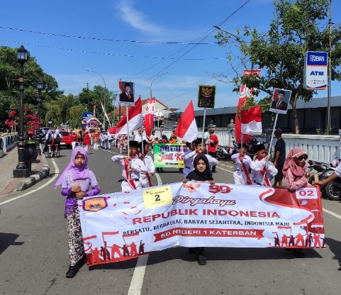 Parade dibuka dengan barisan pembawa spanduk bertema karnaval, lambang negara, pasukan bendera Merah Putih, hingga drumband Gita Jati Kusuma yang mengalun semangat perjuangan. Riuh tepuk tangan warga yang menyaksikan menambah meriah suasana.