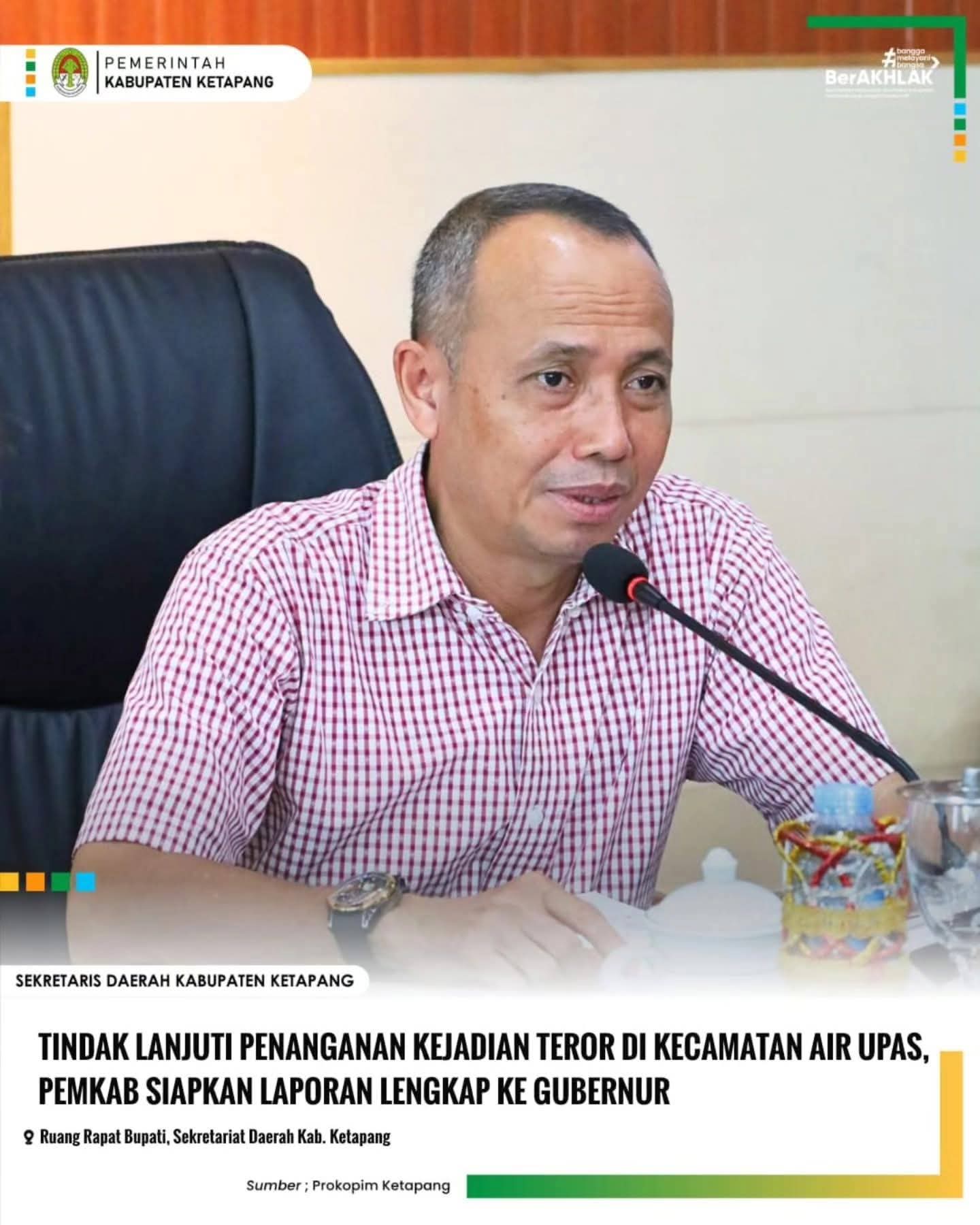Detik Reportase.com kalimantan Barat Pemerintah Kabupaten Ketapang menggelar rapat koordinasi untuk membahas perkembangan situasi keamanan dan ketertiban masyarakat (trantibmas) di Kecamatan Air Upas, yang dalam beberapa waktu terakhir diwarnai oleh serangkaian kejadian teror.